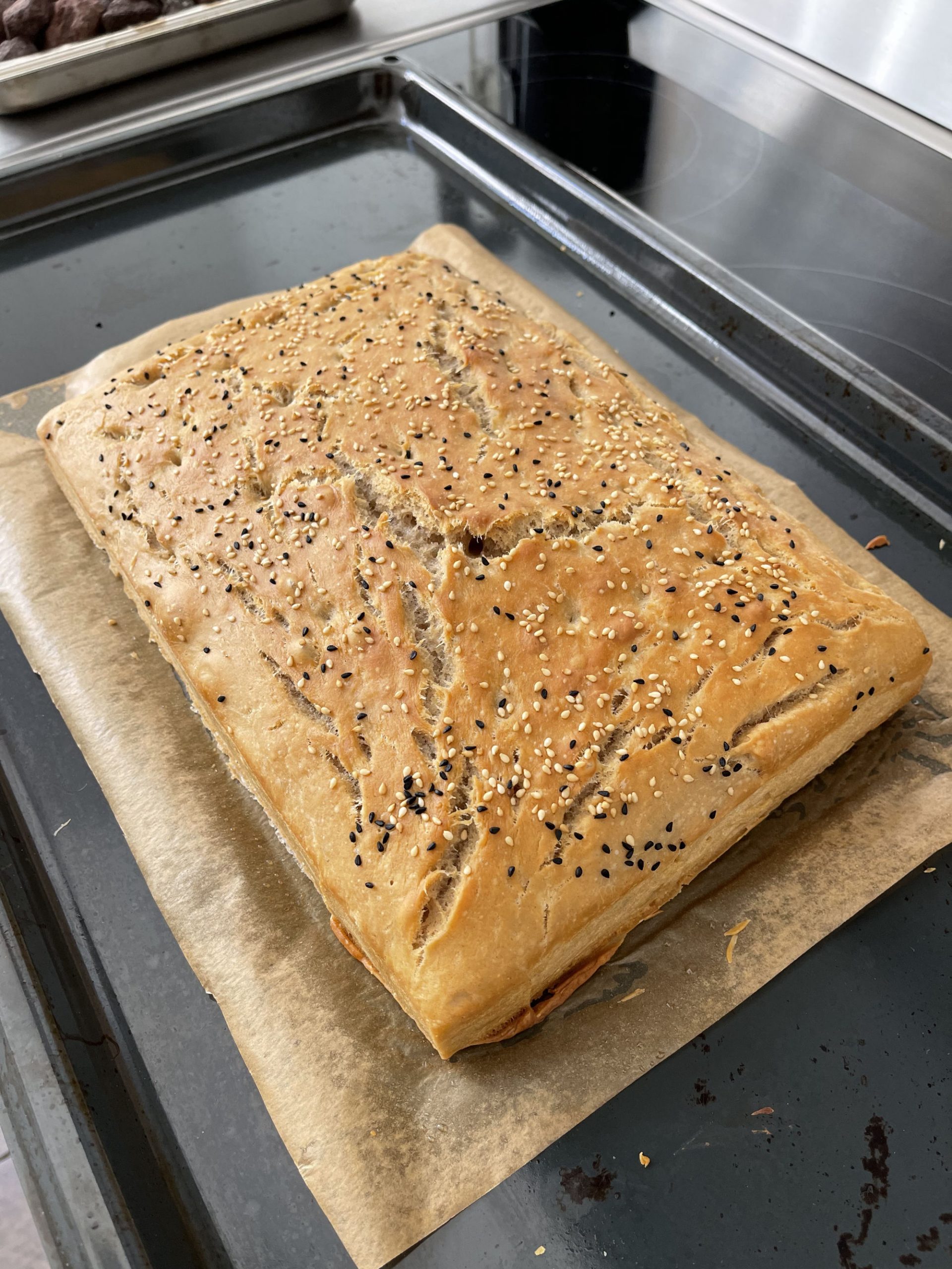 Mehl in eine Schüssel geben. Im Wasser das Salz auflösen, anschließend die Hefe auflösen und zum Schluß das Öl zugeben. Nun alles zum Mehl geben und mit den Fingern ein wenig durchmischen bis ein homogener Teig entsteht. (Wer mag kann den Teig jetzt noch aromatisieren: z.B. mit gehacktem Rosmarin und gehacktem Thymian, mit gehacktem Knoblauch, mit Streifen von getrockneten Tomaten in Öl, mit schwarzen Oliven, mit Speckwürfeln und gehackten Zwiebeln… da sind der Fantasie kaum Grenzen gesetzt). Die Schüssel abdecken und 1h gehen lassen. Nun den Teig einmal stretchen & falten. Schüssel wieder abdecken und den Teig für 24h in den Kühlschrank stellen. Teig noch 1 bis 2 mal stretchen & falten. Den Teig am nächsten Tag noch einmal stretchen & falten und noch einmal 1h in der Küche gehen lassen. Den Ofen auf 250°C Ober- & Unterhitze zusammen mit einer Schüssel mit Lavasteinen vorheizen. Ein Backblech mit Backpapier vorbereiten und einen gefetteten Backrahmen darauf setzen. (Bei einer Backrahmengröße von 20 x 30cm ergibt sich bei der Teigmenge eine Höhe der Focaccia von ca. 6cm. Bei einer Größe von 25 x 35cm ergibt sich eine Höhe von ca. 4cm.) Den Teig hineingeben, Olivenöl darübergeben, den Teig mit den Fingern verteilen, Mulden hineindrücken, nach Belieben noch Kräuter oder Sesam und Schwarzkümmel darüberstreuen und nochmal 1h abgedeckt in der Küche gehen lassen. Das Blech mit dem Teig in den heissen Backofen schieben, ca. 200ml Wasser auf die Lavasteine geben und Backofentür schließen. Hitze auf 200°C reduzieren und nun 35-40 Minuten mit Dampf backen.